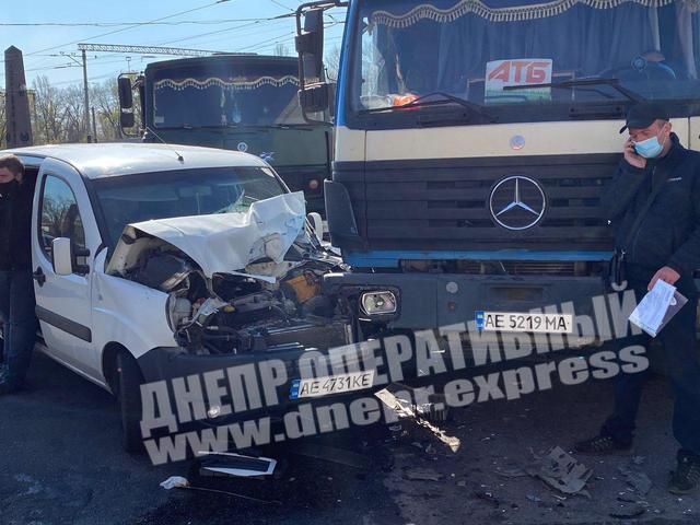 В Днепре на перекрестке ул. Каруны и Мануйловского проспекта произошло серьезное ДТП. Грузовик "АТБ" пытался развернуться на трамвайных путях и его протаранила легковушка.