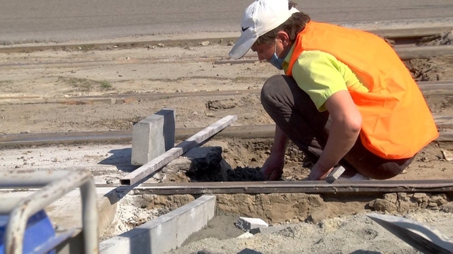 На данный момент работники подрядной организации на основании договора с департаментом ЖКХ снимают асфальтное покрытие и укладывают брусчатку на пешеходном переходе через трамвайные пути в районе пересечения проспектов Свободы и Аношкина (район «Дружбы»).