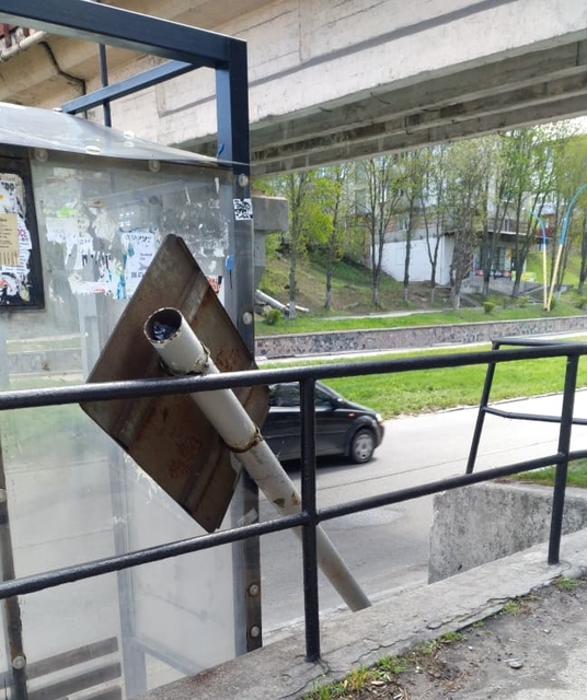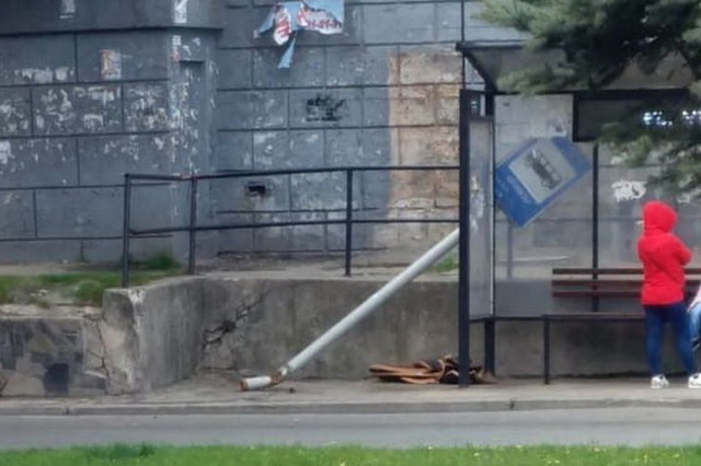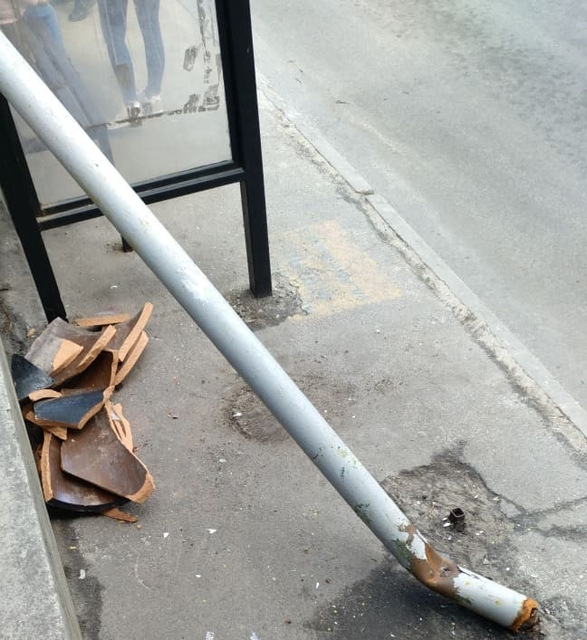 Разбитая урна и поваленный знак на остановке – таковы последствия дрифта неизвестного гонщика по площади Освободителей в Каменском.