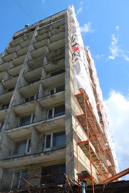 С двух сторон здания уже срезали старые балконные заграждения, которые сейчас сложены на заднем дворе гостиницы. «Мы хотим, чтобы гостиница стала жемчужиной города, поэтому прилагаем множество усилий для придания ей современного и уникального вида. Гостиницу видно из многих мест города, она возвышается в самом центре Каменского, поэтому это задание очень важное», — пояснил Сергей Зацаренко, директор ООО «Трейд Инвест Холдинг». И добавил, что отдельные элементы, такие как оттенок отделки фасада, еще могут измениться, но в целом здание будет выглядеть, как на эскизах.