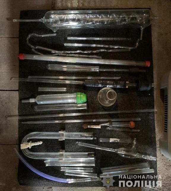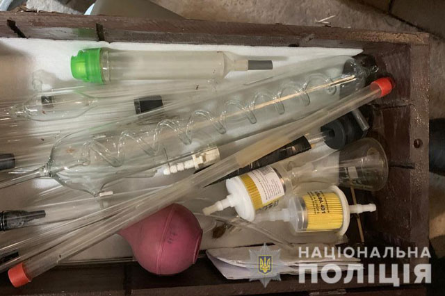В результате в гараже одного из задержанных была обнаружена нарколаборатория, оборудованная лабораторными приборами для изготовления психотропного вещества. В частности, правоохранители обнаружили стеклянные колбы различного объема, медицинские шприцы, фильтры, остатки порошкообразного вещества, прекурсоры. Кроме этого, здесь хранились слип-пакеты с фасованной психотропным веществом «метамфетамин» и электронные весы. По ценам «черного» рынка стоимость изъятых наркосредств составляет около 30 000 гривен. Также во время обыска у одного из мужчин было обнаружено стартовый пистолет калибра 8 мм с признаками переработки.