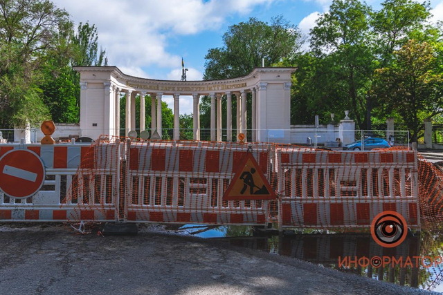 На входе в парк уже сняли часть тротуарной плитки, а на тротуарах площади и частично на проезжей части уже отсутствует асфальт. На проспекте Яворницкого вырыли траншеи для укладки труб. Строительные материалы уже на месте. Напомним, что после окончания работ, площадь станет пешеходной.