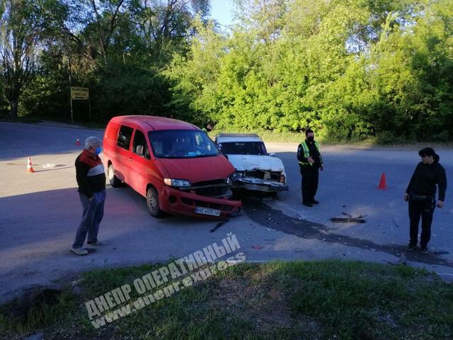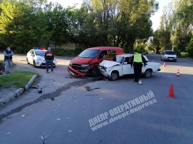 В Днепре легковой автомобиль ВАЗ-2107 на перекрестке равнозначных дорог врезался в микроавтобус Hyundai H200.
