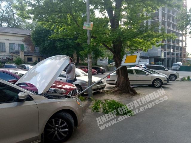 В Днепре произошло необычное ДТП - водитель легкового автомобиля Ford перепутал педали газа и тормоза, и в итоге врезался в дорожный знак и припаркованный рядом легковой автомобиль Volkswagen.