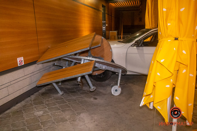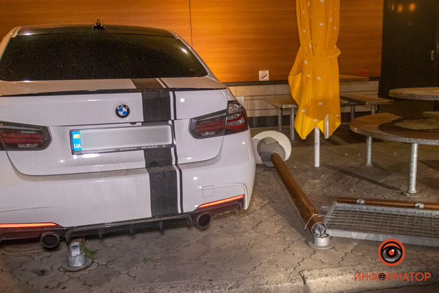 Случилось происшествие около 2:00. На данный момент обстоятельства не выяснены. Известно, что автомобиль выехал на летнюю площадку ресторана со стороны парковки, повредив 3 секции забора, 2 фонаря, 2 стола и остановился впритык к самому зданию.