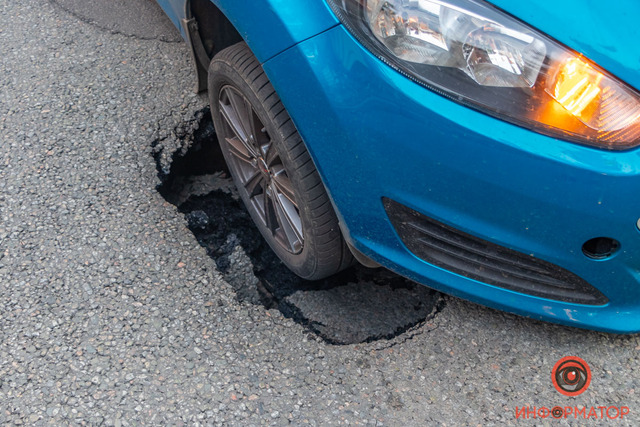 Как рассказала водитель Ford, она поворачивала с улицы Сергея Ефремова на Крутогорный спуск, как почувствовала, что автомобиль просел. Выйдя из машины, женщина увидела, что под передним колесом автомобиля провалился асфальт, о чем она сразу же сообщила в полицию.