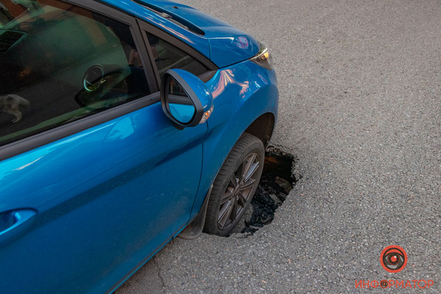 В воскресенье, 14 июня, на Крутогорном спуске под Ford Fiesta провалился асфальт. Автомобиль буквально «застрял в текстурах» передним колесом, и, чтобы вытащить его, пришлось вызывать спецтехнику.