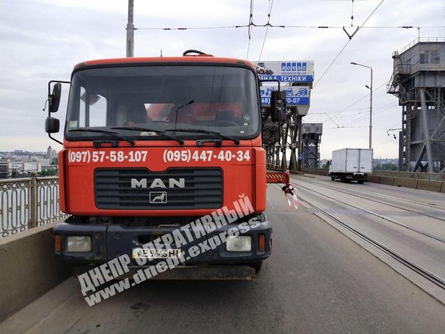В Днепре сегодня на Амурском мосту произошло ДТП – грузовик MAN врезался в отбойник.