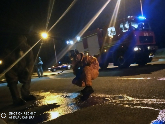 Со слов тех, кто был на месте происшествия, после разлива жидкости произошло самовозгорание, с которым оперативно справились спасатели. Само вещество было фиолетового цвета. Также, очевидцы говорят, что в воздухе стоял резкий неприятный запах.