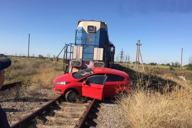 Автомобиль Ford Fiesta пересекал переезд, как в этот момент в него врезался маневровый тепловоз с товарными вагонами. Поезд протащил легковушку ещё 43 метра вдоль колеи.