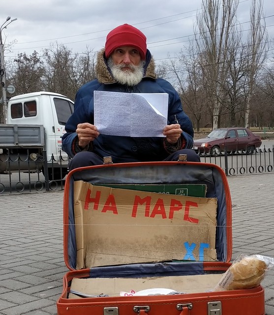 «Этого мужчину знают многие никопольчане. Визуально знают. Мы видим его в любое время года возле супермаркета «АТБ», что на пересечении улиц Преображенской и Электрометаллургов. Он сидит на стульчике, а перед ним на земле неизменно лежит раскрытый чемодан с монетками и булками хлеба. А еще с надписью на внутренней поверхности крышки чемодана: «НА МАРС».