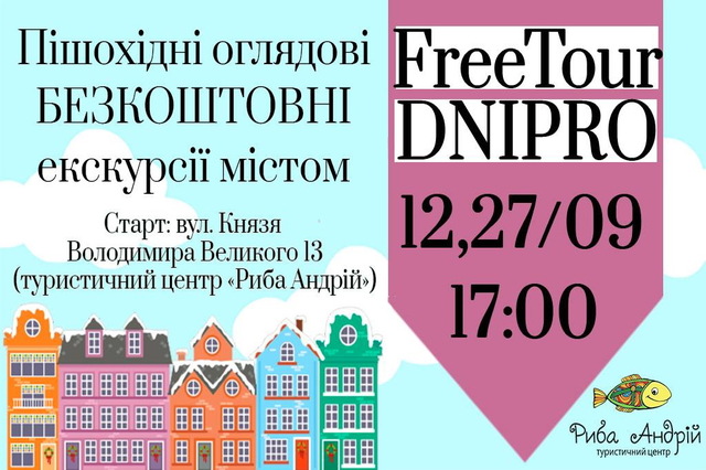 «Якщо ви любите Дніпро так, як любимо його ми, тоді йдемо з нами дивитись на визначні місця нашого міста! – приглашают в этом центре всех горожан. - Безкоштовні тури вже давно проводять у містах Європи і вони користуються шаленою популярністю.За участие в экскурсии платить – не обязательно. Но если прогулка по историческому центру Днепра очень понравится, ее участники могут сделать взнос экскурсоводу – кто сколько пожелает.Місце зустрічі: вул. Князя Володимира Великого 13. Початок: 17:00. Тривалість: 2-2,5 години».