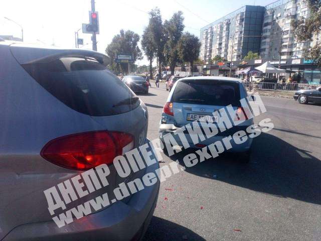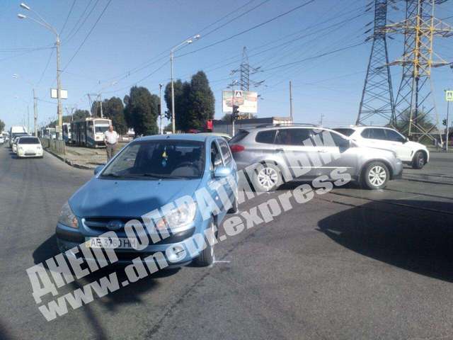 В Днепре на Донецком шоссе Subaru врезался в Hyundai: ДТП заблокировало движение трамваев (момент аварии)