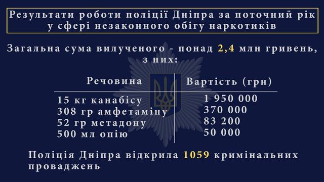 У поточному році підрозділами Дніпровського відділу поліції зареєстровано 1 059 кримінальних проваджень у сфері незаконного обігу наркотичних засобів, психотропних речовин, їх аналогів або прекурсорів. 433 правопорушникам оголошено про підозру, з них 54 наркозбувачам.