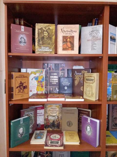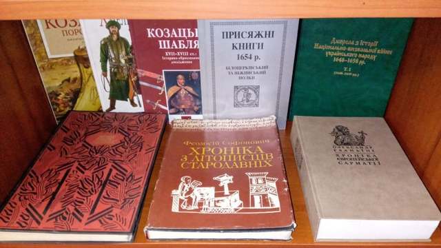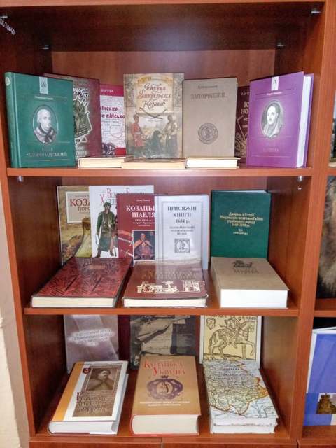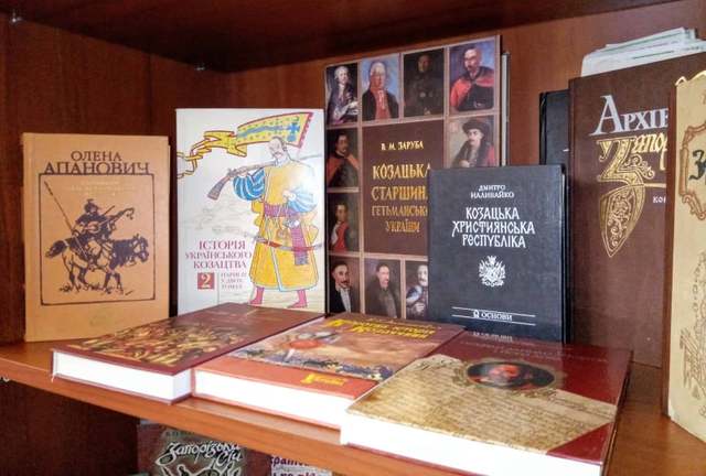 Головне місце на виставці займають твори українських істориків – класичні праці та здобутки останніх десятиліть. Почесне місце, природно, належить працям Д.І. Яворницького – головного дослідника українського козацтва. «Історія запорізьких козаків», «Запорожжя в залишках старовини та переказах народу» - ці праці ввійшли в золотий фонд української історіографії.