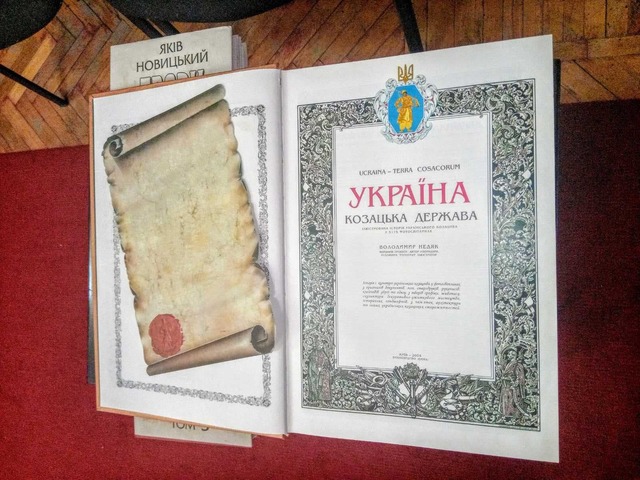 Одним із найцінніших експонатів на виставці є фоліант «Україна – козацька держава» (2004). Ця книга сама по собі є видатною пам’яткою книговидання і займає окреме почесне місце в історіографії козацтва останніх десятиліть.