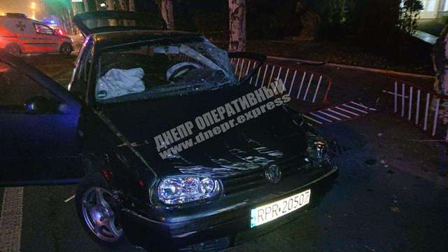 В Днепре легковой автомобиль Volkswagen Golf с польскими номерами врезался в металлическое ограждение: в аварии пострадали водитель и пассажир машины.
