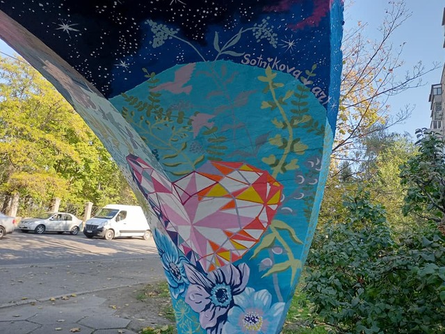 «Вот так теперь выглядит старая бетонная конструкция (остановка) на углу ул. Байкальская и пр. Слобожанский!».Жители района – в восторге от этой красоты… Правда, некоторые сомневаются, долго ли продержится новая роспись.
