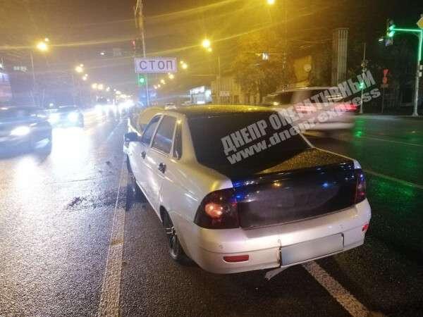 Авария произошла сегодня на Слобожанском проспекте. Автомобиль ВАЗ двигался по направлению к торгово-развлекательному центру "Наша правда" в крайней левой полосе. В определенный момент едущий впереди него автомобиль начал притормаживать. Водитель ВАЗ также начал торможение на мокрой от дождя дороге, чтобы избежать столкновения, затем ушел влево и врезался в отбойник.