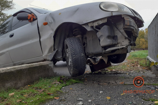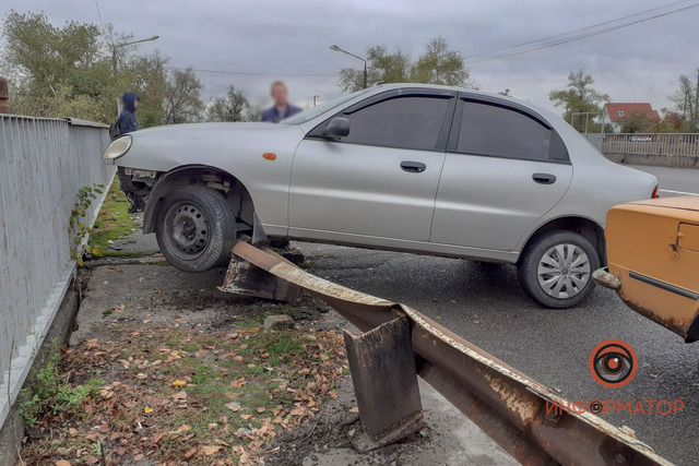 В Днепре на Гаванской Daewoo Lanos врезался в отбойник и повис на ограждении