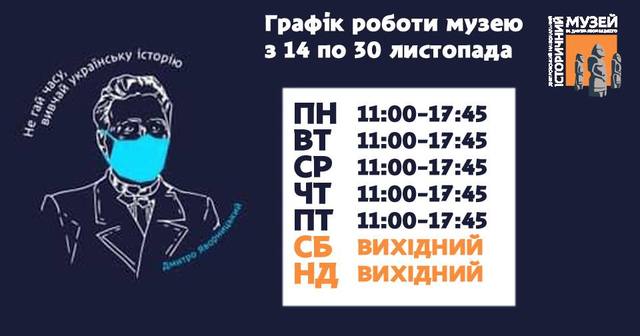 У зв’язку з встановленням «карантину вихідного дня», на період з 14 по 30 листопада 2020 р. музей працює за наступним графіком: