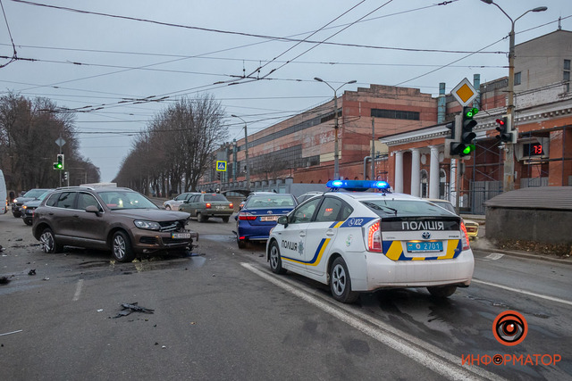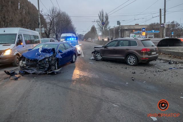 ДТП случилось возле проходной ЮМЗ. По предварительной информации от правоохранителей, Volkswagen ехал по Макарова со стороны улицы Строителей. Toyota двигалась по Макарова от Криворожской и поворачивала на Титова. В этот момент произошло столкновение.