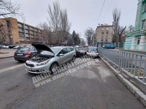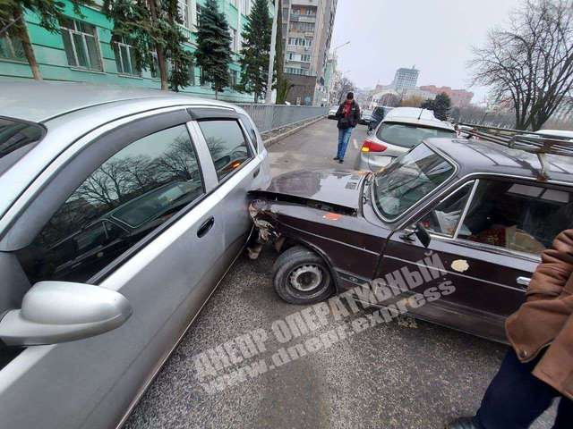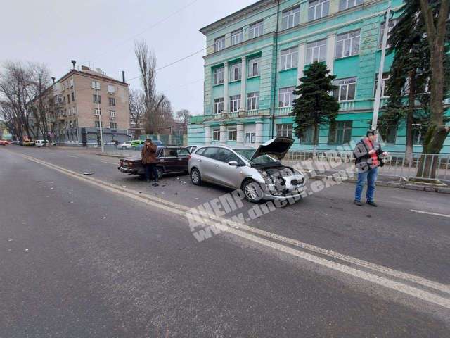В Днепре произошло столкновение легковых автомобилей ВАЗ-2101 и Kia Ceed: от удара автомобиль ВАЗ отбросило в припаркованный Chevrolet Aveo.