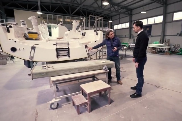 Генеральный директор OTIS TARDA Андрей Тимошенко показал Артему Хмельникову, как идет производство корпуса будущей лодки. Он весит 320 кг. Это немного для яхты такого размера. Легкости удалось добиться благодаря применению высоких технологий: сэндвич из вспененного материала внутри, покрытого сверху двухмилиметровым слоем стеклопластика. Палубу и корпус соединяют специальным материалом, позволяющим не просто склеить элементы, но и обеспечить герметичность. «Главное – легкость. Такой корпус всего 300 кг – это фантастика!», — подчеркнул Андрей Тимошенко. Общий вес судна не превышает 2 тонн.