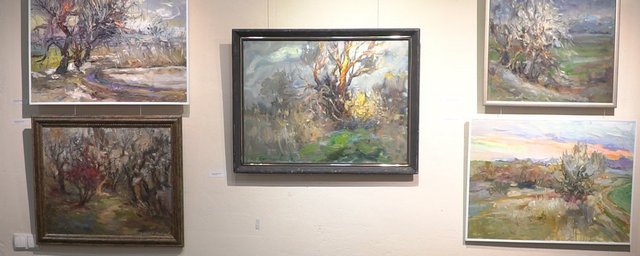 На полотнах изображены пейзажи Днепропетровщины, Донетчины и Западной Украины. Также натюрморты и портреты, говорит автор.
