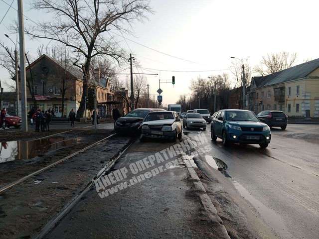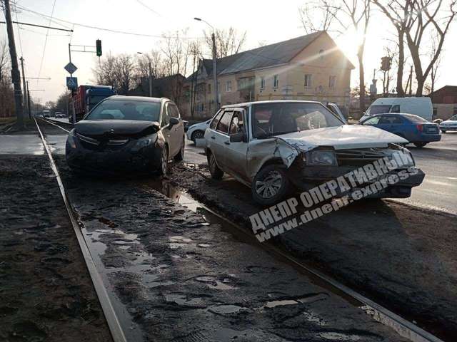 В Днепре сегодня, 26 февраля, столкнулись легковые автомобили ВАЗ и Opel: от удара Opel вынесло на трамвайные пути, в связи с чем было заблокировано движение трамваев.