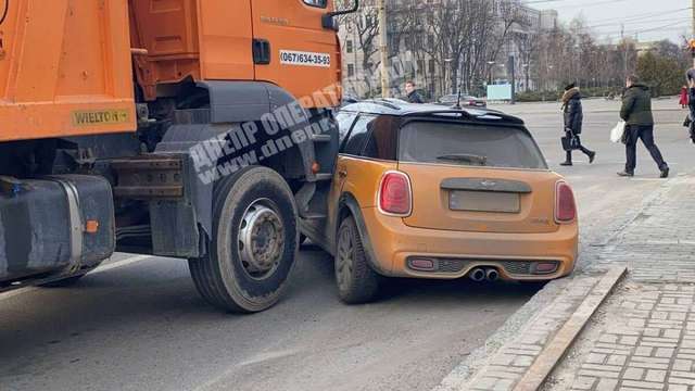 В Днепре сегодня, 4 марта, грузовой автомобиль MAN врезался в легковой автомобиль Mini Cooper и протащил на несколько метров: в аварии никто не пострадал.