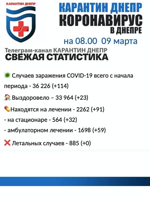 Как сообщила пресс-служба горсовета, 8 марта в Днепре у 114 человек выявили коронавирус. Всего с начала эпидемии 36 226 днепрян заболели ковид-19.