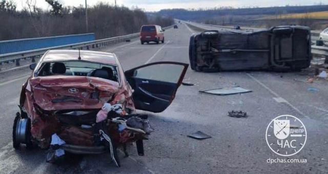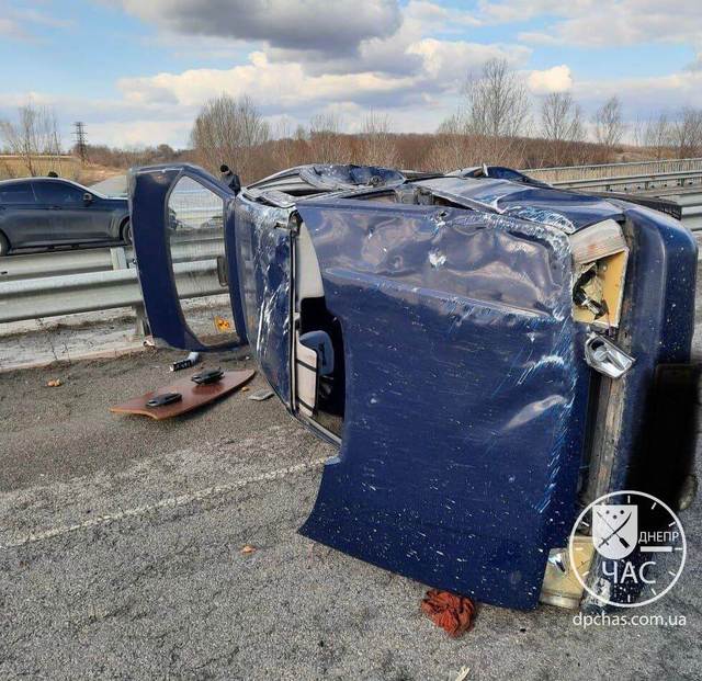 Во время движения в сторону Днепра у Нyundai лопнуло колесо, из-за чего машину занесло в отбойник. После столкновения с ним авто отбросило в "Славуту".