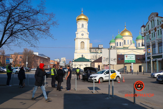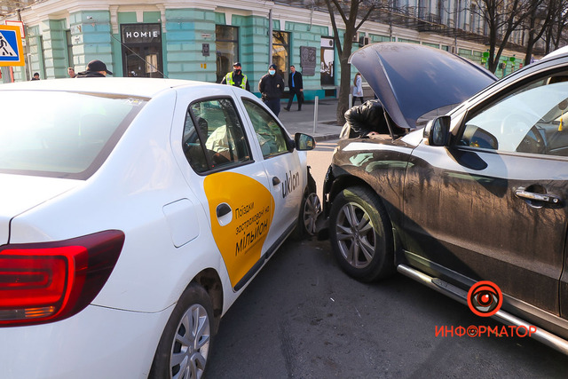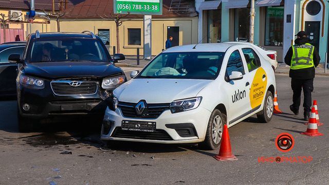 Авария случилась примерно в 9:20 на перекрестке с улицей Троицкой. По предварительной информации от патрульных, Renault службы такси Uklon ехал по Грушевского со стороны проспекта Яворницкого. Hyundai двигался по Троицкой от Воскресенской. На перекрестке водитель Hyundai не предоставил преимущество и врезался в Renault.