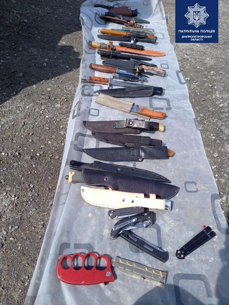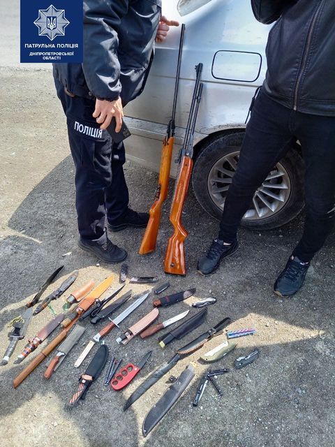 В автомобиле находились двое мужчин. Во время поверхностной проверки на заднем сиденье патрульные обнаружили 15 ножей разных размеров, а также пистолет, кастет и два пневматических ружья. Объяснить для чего и откуда оружие, водитель не смог.