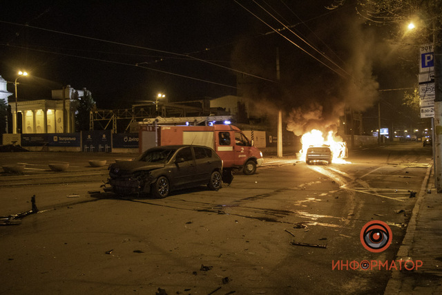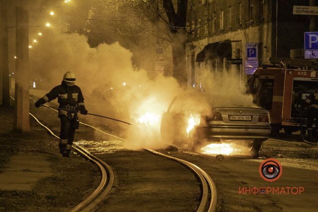 Со слов водителя BMW, авто двигалось по проспекту Яворницкого в сторону вокзала. На улицу Половецкую, пересекая проспект Яворницкого от дома профсоюза, ехала на большой скорости Mazda, в которую врезалась BMW. Предварительно, причиной возгорания BMW был сильный удар. Пожар потушили в течение короткого времени.