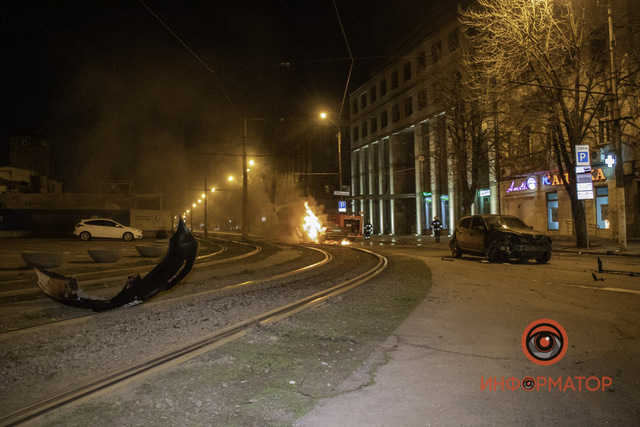 В четверг, 22 апреля, в 22:44, на проспекте Яворницкого, возле оперного театра столкнулись Mazda и BMW, последняя загорелась. На месте работают пожарные, газовая служба, медики скорой помощи.