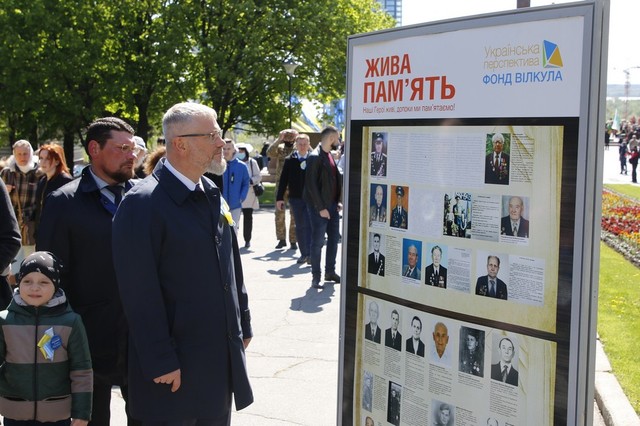 Жители Днепра вместе с Александром Вилкулом и ветеранами возложили цветы к мемориалу «Вечная слава». Большой интерес горожан, пришедших к памятнику, вызвал арт-проект Фонда «Украинская перспектива» - «Живая память». Стенды с более чем 1100 фото солдат Красной Армии, победивших нацизм, размещены на аллее. Фото с историями для экспозиции прислали волонтерам Фонда жители Днепропетровщины.