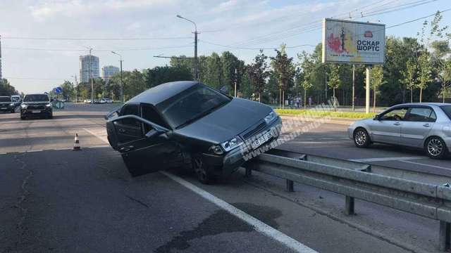В Днепре на Набережной Победы автомобиль Daewoo врезался в автомобиль ВАЗ: от сильного удара ВАЗ отбросило в отбойник посередине дороги.