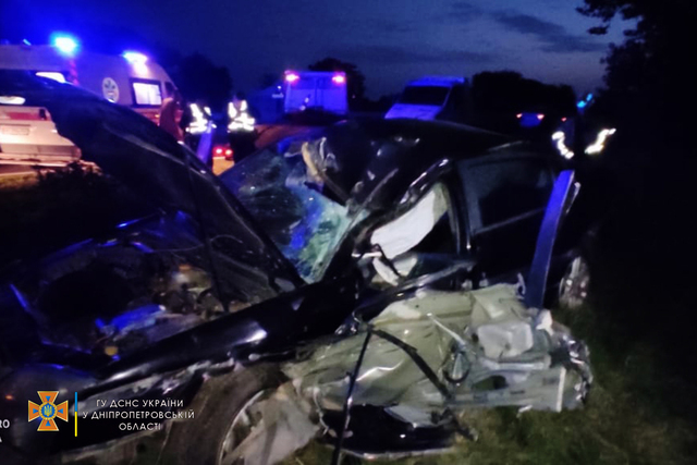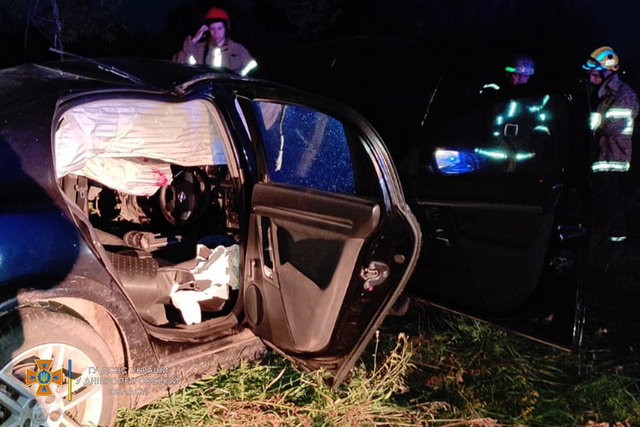 Автомобиль двигался в направлении города Днепр. Вероятно, водитель не справился с управлением, съехал с дороги и столкнулся с деревом. Водитель оказался зажатым в обломках машины.