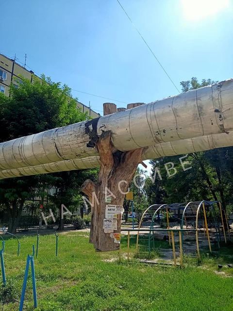 Так, например, на жилмассиве Калиновский (бывший Клочко), напротив 63-й школы опорой для двух магистральных труб теплотрассы стал разветвленный ствол давно усохшего и спиленного дерева. От ствола осталась своеобразная «рогатка», на которой и возлежат огромные трубы.