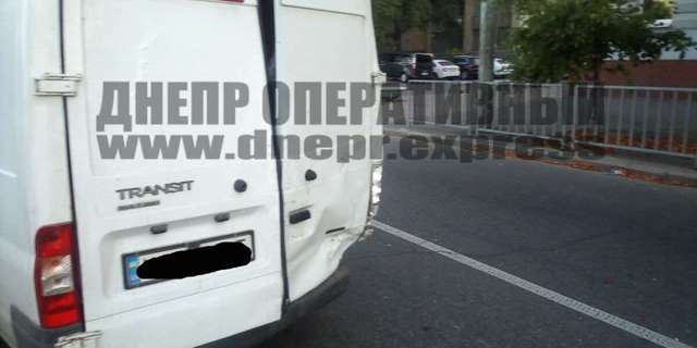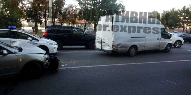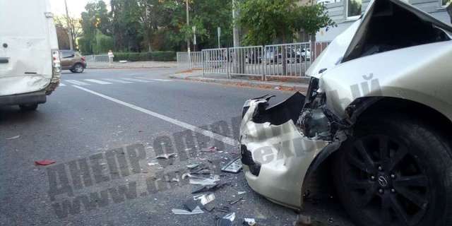 В Днепре Mazda столкнулась с Ford Transit. Водитель последнего остановился перед пешеходным переходом, на что находящийся сзади автомобилист не успел среагировать.