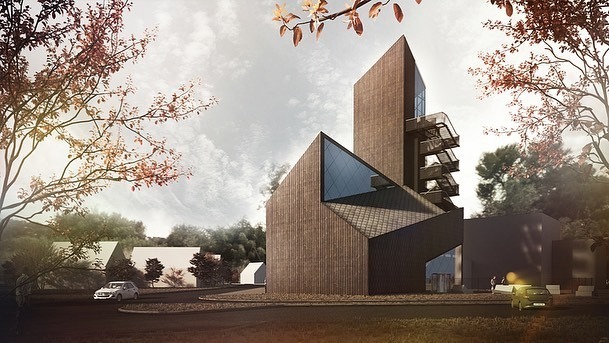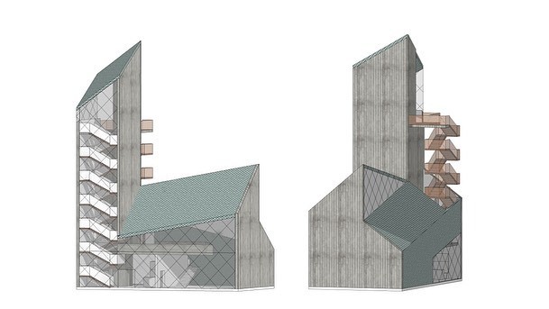 Мы уделили особое внимание фактуре и форме. Фасад - дает нам не прямую отсылку к первым казацким церквям, и одновременно напоминает большую латинскую L, первую букву в слове loodsman (от нидерландского «судоводитель»), а также ломаная форма кровли похожа на днепровские пороги. Фактура старой палубной доски дает отсылку к сплаву леса, а чешуйчатая поверхность оцинкованной черепицы подобна искрящейся глади Днепра на солнце».