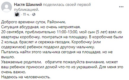 Пост в соцсети опубликовала днепрянка Анастасия. Женщина рассказала, что ее 5-летний сын каким-то образом взял ее коробочку с украшениями на детскую площадку. А она этого не заметила. Внутри были 2 кольца, браслет и сережка в форме гвоздика.