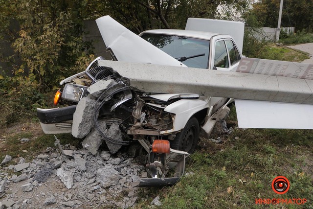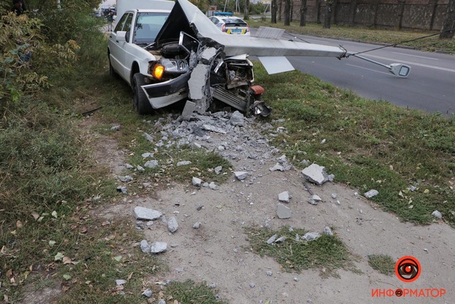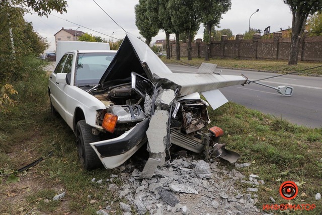 В субботу, 9 октября, на улице Криворожской автомобиль Mercedes Benz врезался в столб. В результате столкновения электроопора упала на автомобиль.