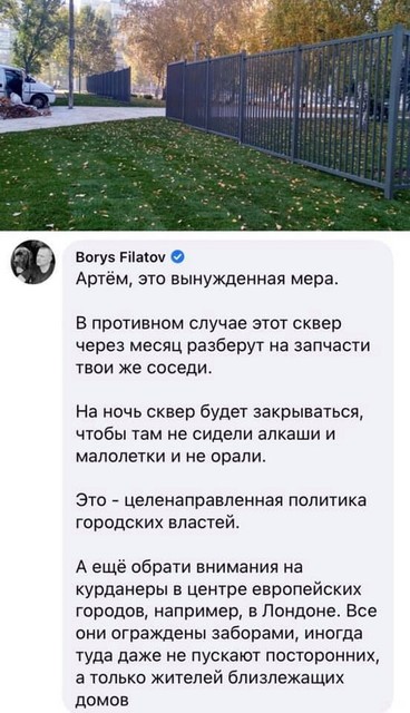 А ещё обрати внимания на курданеры в центре европейских городов, например, в Лондоне. Все они ограждены заборами, иногда туда даже не пускают посторонних, а только жителей близлежащих домов».