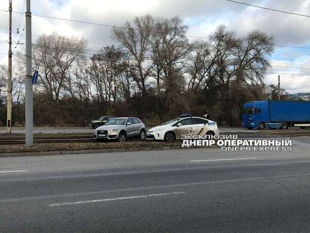 В Днепре на въезде на Кайдакский мост автомобиль Audi выехал на рельсы и парализовал движение трамваев. Женщину, находившуюся за рулем автомобиля, госпитализировали.