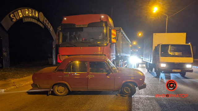 В среду, 24 ноября, на съезде с Кайдакского моста возле жилмассива Ломовский случилось ДТП. Здесь столкнулись фура Mercedes и ВАЗ 21053.
