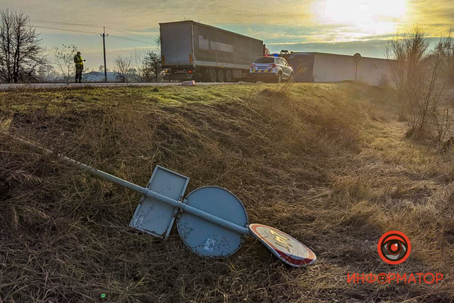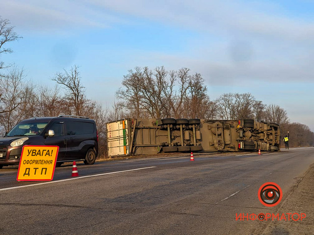 Заблокирован проезд в сторону Днепра в районе поворота на село Ивановка, одна полоса занята. Производится реверсивное движение. Примерно в 10:00 фуру должны убрать с дороги.