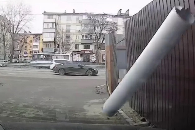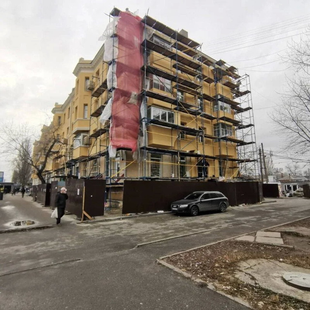 В Днепре на Слобожанском проспекте с фасада одного из домов, который утепляют, упала труба. Она приземлилась на припаркованный рядом со стройплощадкой автомобиль — у машины повреждён капот.